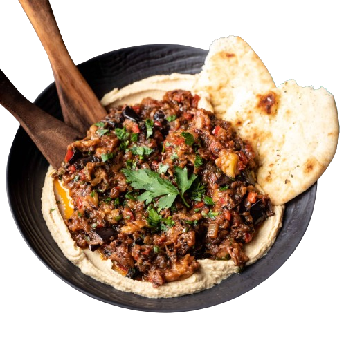 Roasted & smoky eggplant mashed with tahini, garlic, lemon juice and spices.